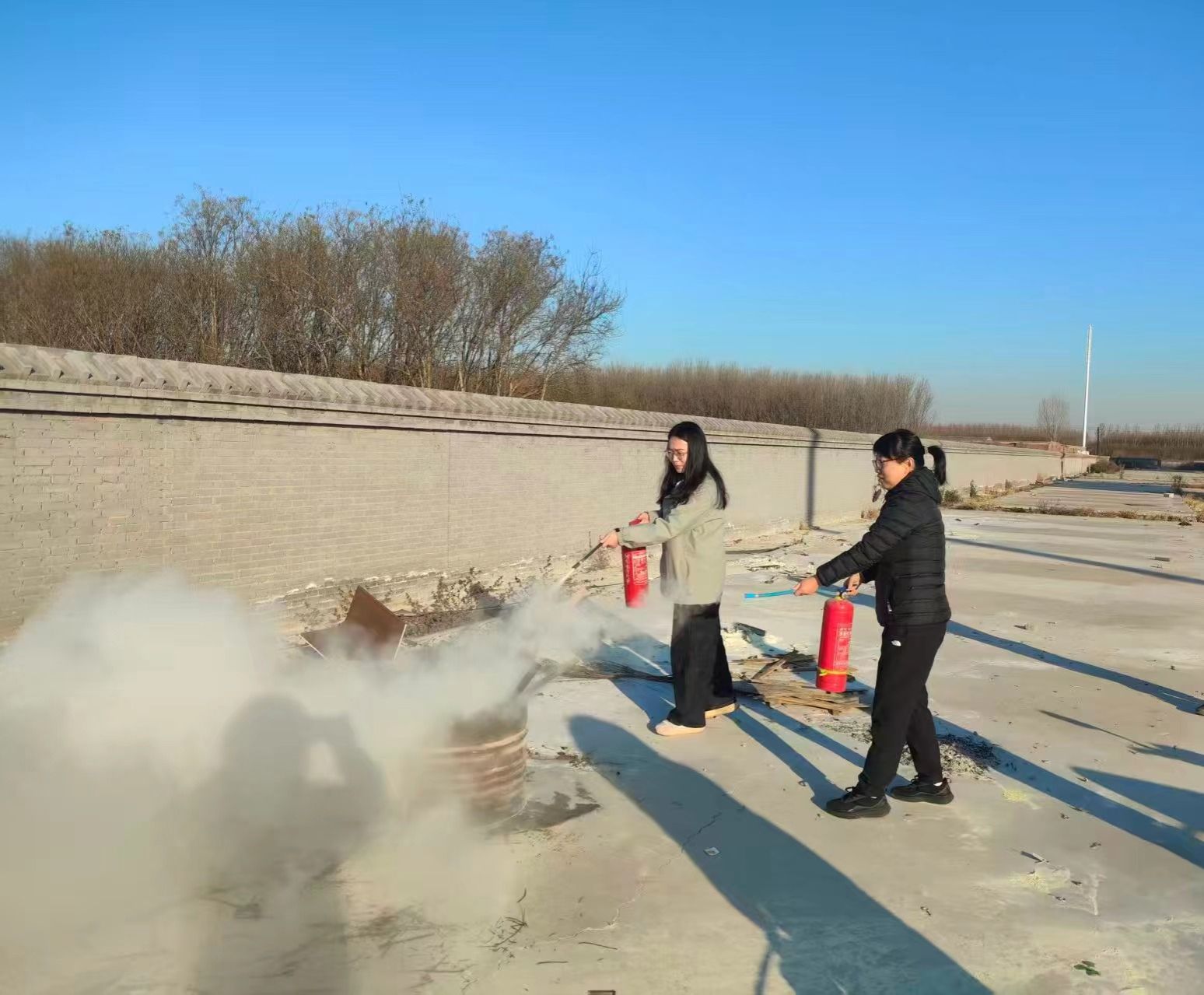 讲座结束后,培训进入实操演练环节。安全工作处康老师现场示范了干粉灭火器的“提、拔、握、压”使用步骤,详细说明操作过程中的关键要点和安全注意事项。随后,全体教职工分组进行灭火器实操演练,大家按照规范流程逐一操作,亲手体验灭火过程。